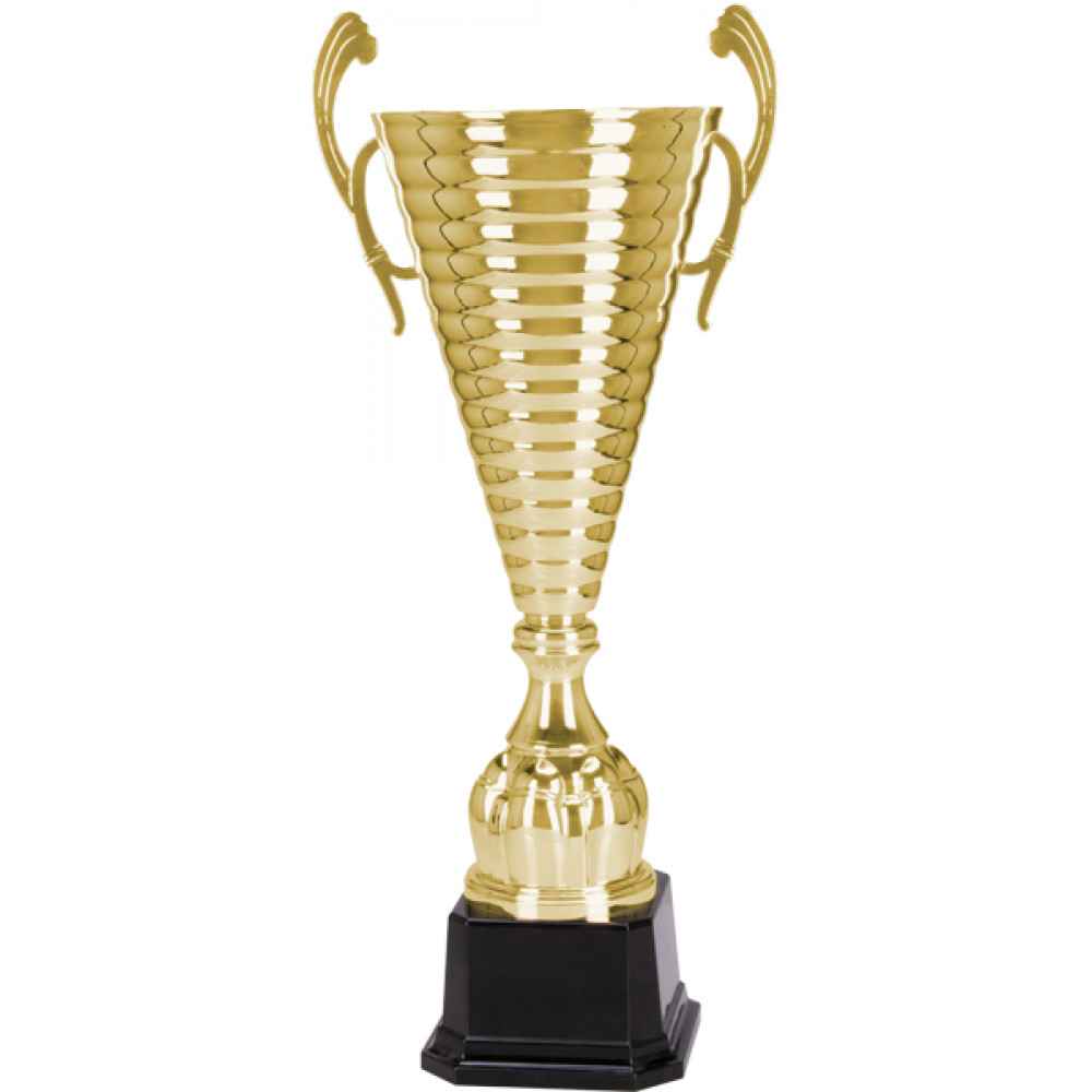 Кубок металлический, состоит из чаши, стема и цоколя. ¶Чаша кубка изготовлена из стали с гальваническим покрытием, цвет внутри и снаружи - золото. К чаше прикреплены ручки, выступающие за её края. Ручки украшены двумя тонкими вдавленными линиями.¶Чаша глубокая, в форме перевернутого конуса. На чаше по всему периметру располагаются горизонтальные выпуклые линии. ¶Стем кубка выполнен из металлизированного пластика, цвет - золото. Стем имеет форму конуса. В верхней части стема находится элемент в виде кольца. В нижней части стема расположены выпуклые лепестки, стремящиеся вверх, по всему диаметру, стем имеет отступ внизу, установлен на цоколь. ¶Цоколь в форме восьмиугольной фигуры, с отступом внизу. Стороны и углы фигуры не равные. Материал цоколя - пластик, цвет - черный.