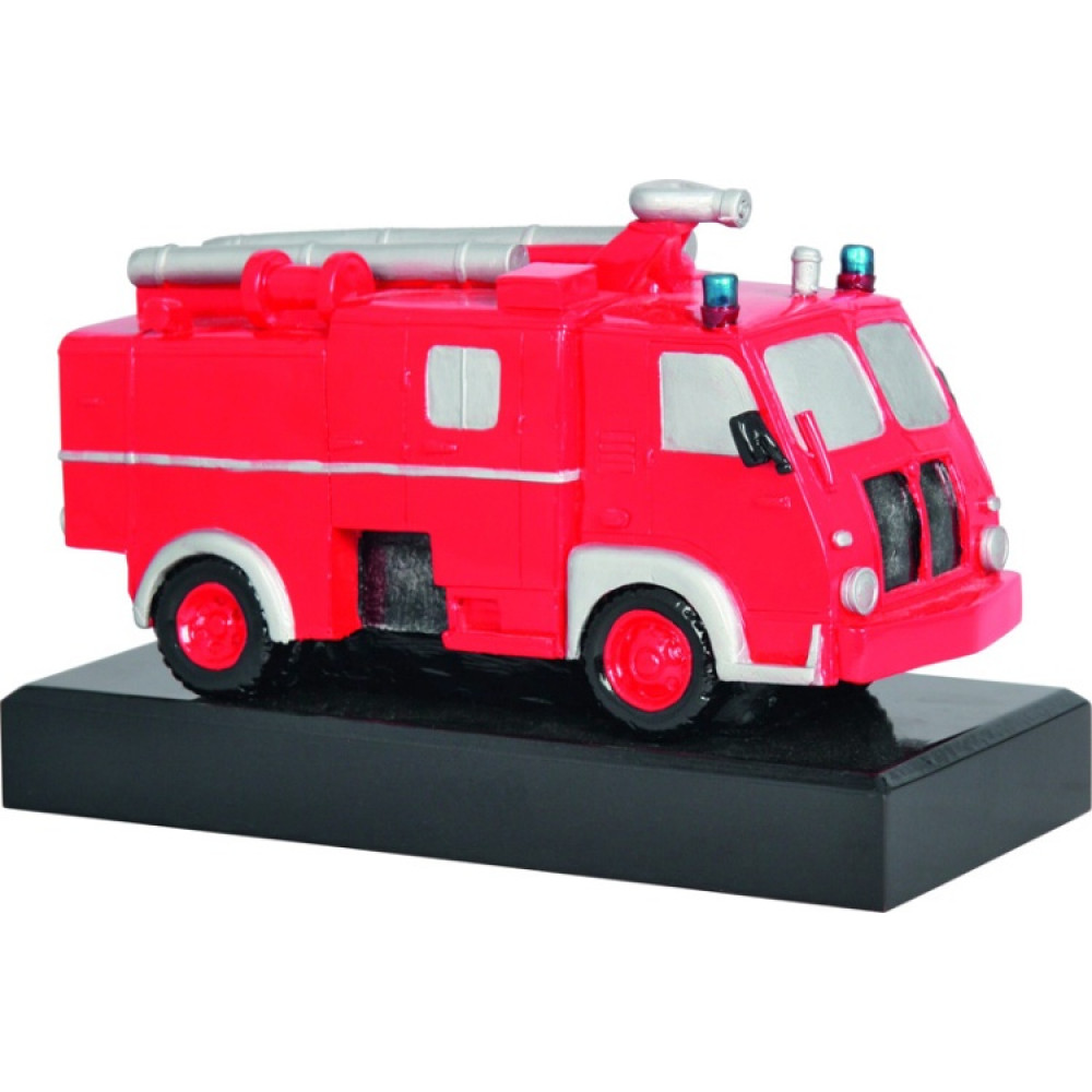 Фигурка литая "Пожарный". Высота 14,5 см. Изображена пожарная машина красного цвета. Машина выглядит "игрушечной". Фигура установлена на черной подставке в форме прямоугольника.