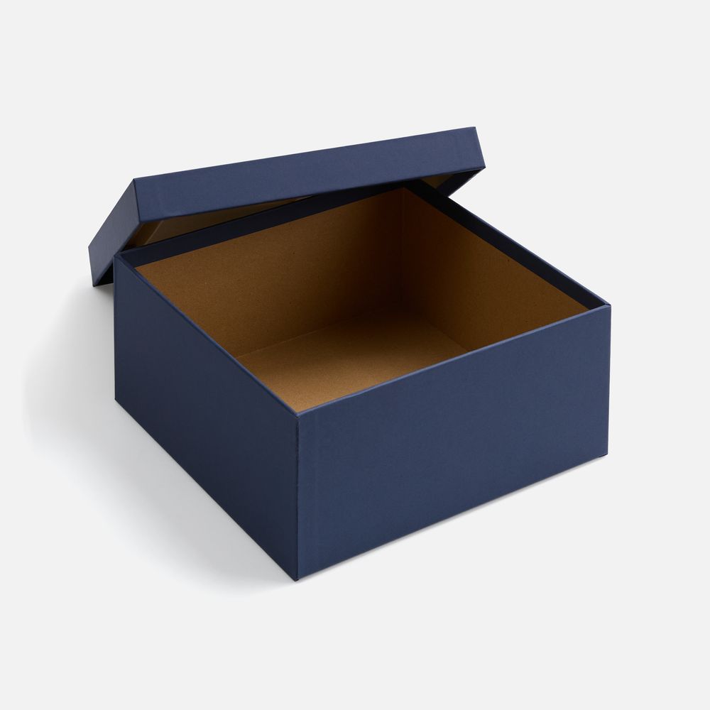 Коробка из переплетного картона, кашированного синей дизайнерской бумагой.