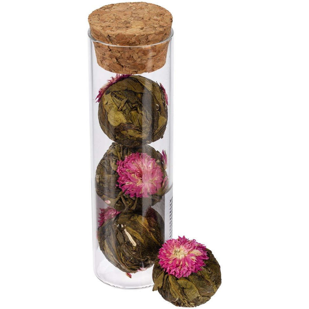 • связанный зеленый чай с цветами «Нефритовый Лотос» (состав: зеленый чай сенча, цветы хризантемы), вес 25 г — благодаря особой технологии скрутки чай, словно цветок, распускается в чайнике или чашке, при заваривании рекомендуем использовать прозрачную стеклянную посуду;