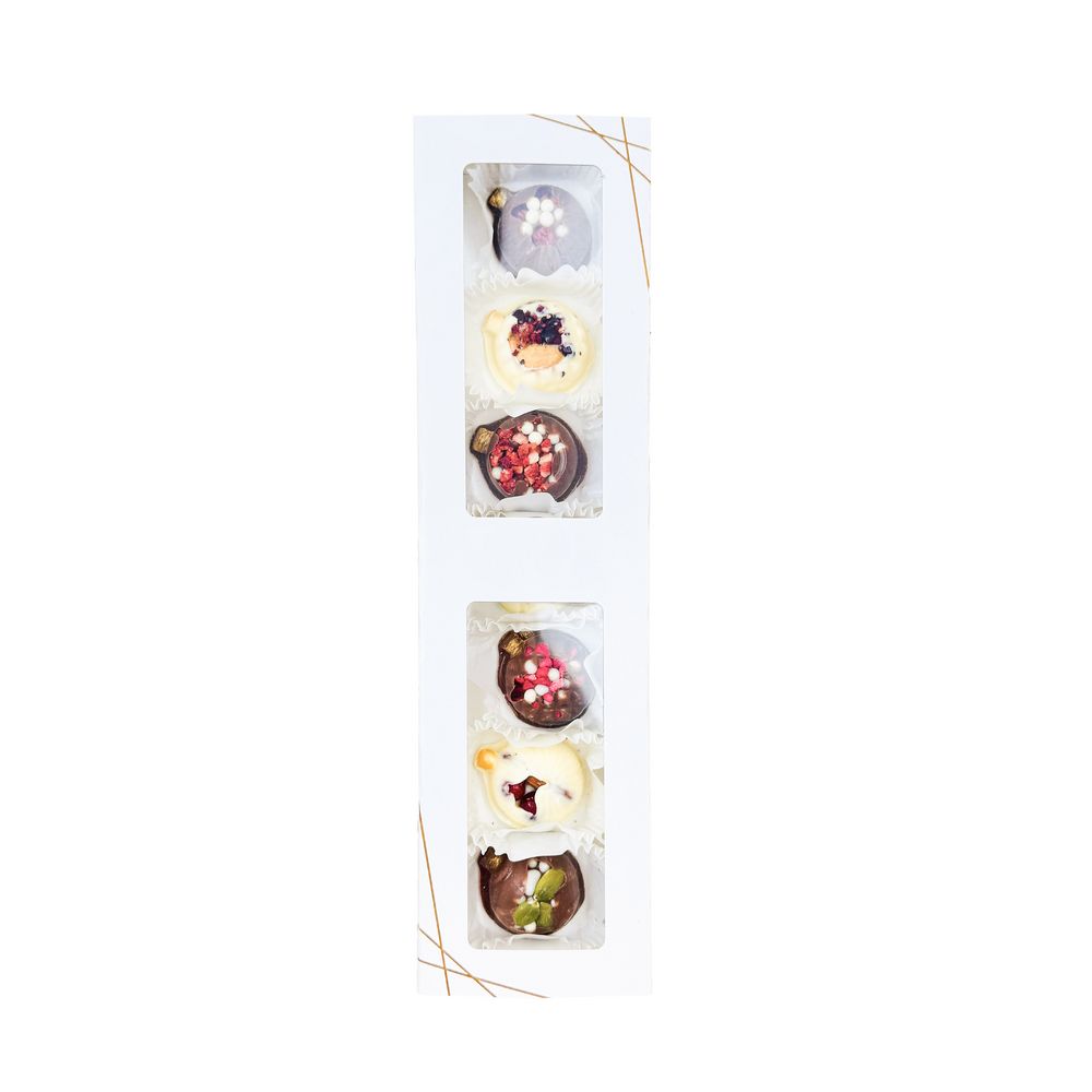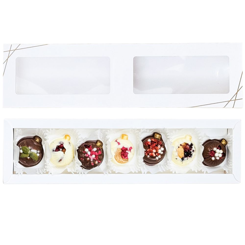 Набор включает шарики из молочного и белого шоколада с добавлением сублимированной малины, клубники и манго, кешью, миндаля, тыквенных семечек и воздушного риса. Прекрасное сочетание для праздничного настроения!